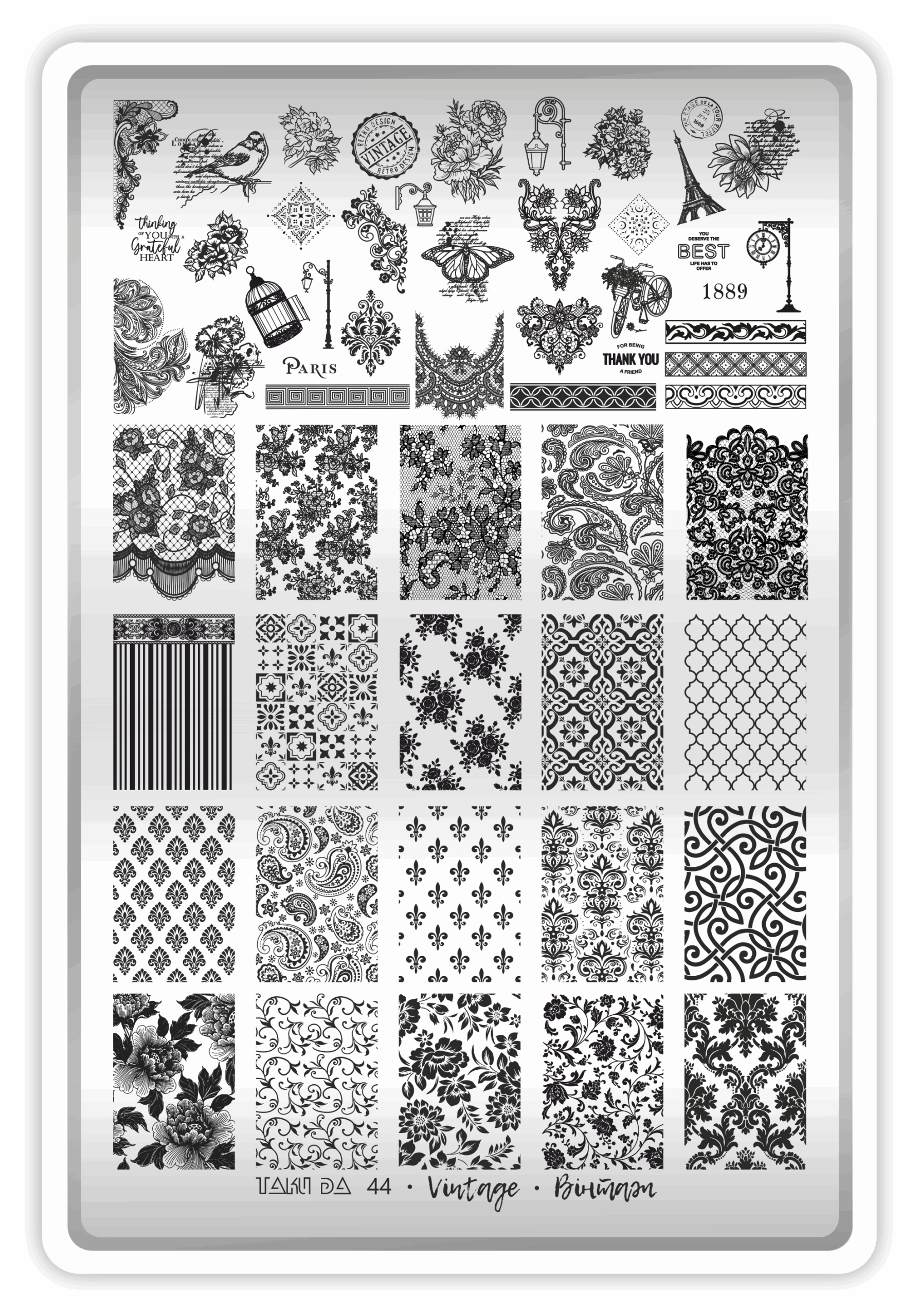 Stamping Plate DEMO Taki Da – 44 VINTAGE – Stamping-Schablone mit Demo-Sheet 10×15 cm (mit Vorlagenblatt)
